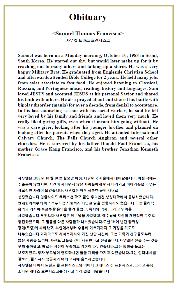Sam's parents - Grace and Don Francisco Don and Sam visiting San Francisco Don, Sam and Auntie Don, Jonathan and Sam Sam with Grandma and Dad The Francisco boys Don and Sam Sam and Auntie Sam, Don and Jonathan Sunset at Virginia Beach that Sam enjoyed. Sam relaxing at the hotel lobby. Don and Sam at home Sam's baby picture Don and Sam on a patriotic day. Sam enjoying his music. Sam in Virginia Beach Grace celebrating Sam's 37th birthday in heaven Don and Sam Sam and his smile. Sam giving his Dad a foot massage Another smiling face from Sam Sam's memorial. Grace and Don at Sam's memorial Jonathan at Sam's memorial.